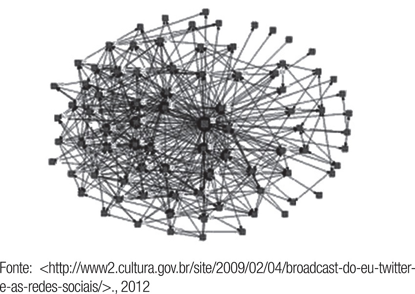 Nessa linha de raciocínio, tomemos a mídia, que nesta reflexão nos interessa em particular, já que atua na base do estabelecimento de relações sociais na sua forma ampliada, ou seja, com o uso de ferramentas informáticas. Até determinado momento, a experiência humana com a mídia havia se organizado a partir de uma estrutura midiática hierárquica que correspondeu à organização da sociedade, articulada em torno do conceito de broadcasting, com uma produção centralizada emitida para as massas por meio de uma estrutura de comunicação unidirecional em níveis. Ou seja, a estrutura midiática e a organização social mantinham uma relação de similaridade, ambas verticalizadas na sua produção e organização.