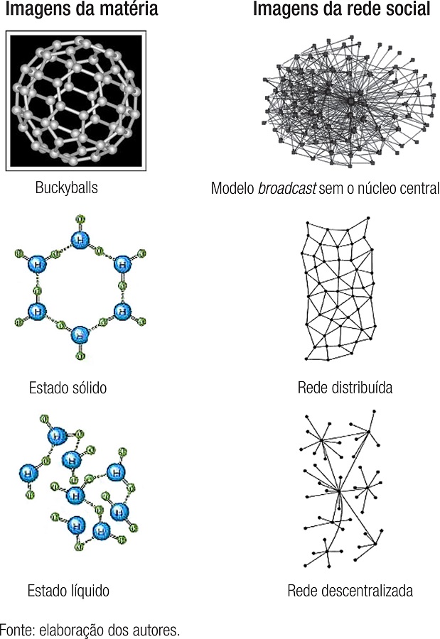 Dessas representações, procuramos realizar uma comparação entre a simbologia utilizada para representar os estados da matéria e as construções imagéticas culturais, buscando perceber as similaridades entre as estruturas da natureza e a configuração das redes sociais. Vejamos as imagens a seguir: