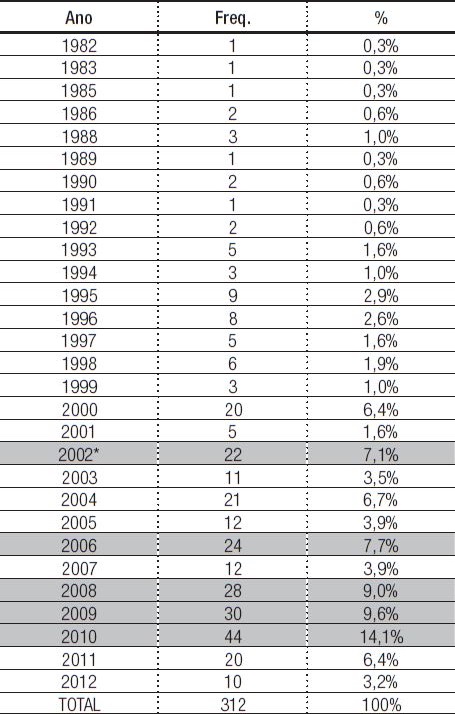 Para analisar se a quantidade de grupos ano a ano poderia apresentar um crescimento regular, ou seja, uma elevação esperada, foi utilizado o teste do Qui 2. O resultado nos mostrou que os anos de 2002 (7,1%), 2006 (7,7%), 2008 (9%), 2009 (9,6%) e 2010 (14,1%) apresentaram quantidade de grupos que foi considerada acima da quantidade esperada dentro da curva de crescimento em relação aos anos anteriores. Isso nos indicou que o assunto pode, de alguma maneira, ter mobilizado os pesquisadores de forma mais intensa a partir do início do século XXI.