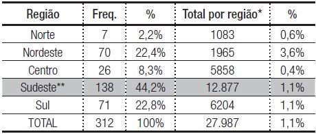Procuramos empreender a análise também em termos geográficos, organizando os dados segundo as regiões brasileiras. Vejamos abaixo.