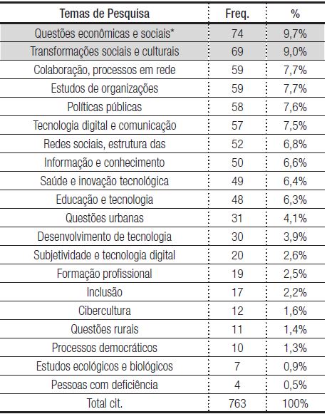 Nessas áreas, os cursos de comunicação e educação são os que mais possuem grupos de pesquisa vinculados, pois apresentaram valores acima do esperado, em função dos resultados encontrados com o teste estatístico aplicado. E, para finalizar os dados de perfil desses grupos, realizamos tratamento analítico e estatístico para compreender suas temáticas de maior interesse. Para tanto, fizemos inicialmente um trabalho de categorização sobre a variável em que foram inseridos na íntegra os textos de descrição do grupo e das linhas de pesquisa registrados na base de dados do CNPq, que devem refletir o escopo de atuação do grupo. Cabe ainda observar que a quantidade de citações é superior à quantidade de grupos de pesquisa, pois essa variável era de múltipla escolha, já que, em geral, os grupos tratavam de mais de um tema. O resultado encontra-se na Tabela 4.