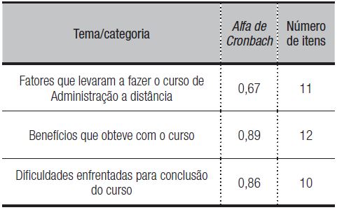 O teste de confiabilidade do Alfa de Cronbach das variáveis do tema/categoria fatores que levaram a fazer o curso de administração teve um valor abaixo do mínimo aceitável (mas muito próximo do ideal). Por essa razão, devem-se analisar os resultados obtidos nesse tema/categoria com certa limitação.