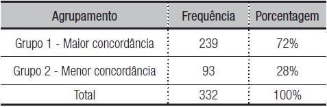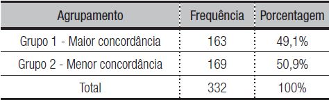 A frequência dos 332 respondentes para cada cluster formado pode ser visualizado na Tabela 4.