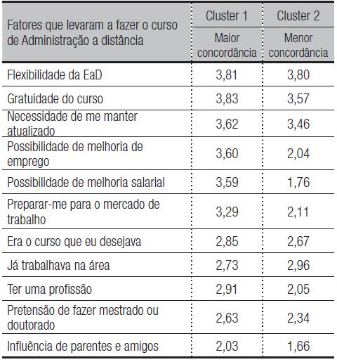 A partir da Tabela 3, podem-se inferir algumas observações a respeito das variáveis. Na variável flexibilidade da EaD, a qual teve escores médios de concordância bem próximo no cluster 1 e 2, demonstra-se que houve homogeneidade na percepção dos respondentes. Já a possibilidade de melhoria salarial foi a variável que apresentou maior diferença de concordância entre os dois clusters, demonstrando visões divergentes entre os pesquisados.