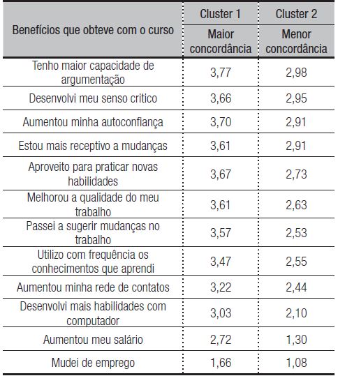 Destaca-se na Tabela 5 que a variável mudei de emprego foi aquela, entre as analisadas, que obteve menor diferença entre os escores médios de concordância no cluster 1 e 2, demonstrando maior homogeneidade na percepção dos respondentes em detrimento das outras variáveis. Já a variável aumentou meu salário foi a que apresentou maior diferença de concordância entre os respondentes agrupados nos dois clusters, demonstrando visões discrepantes entre eles. Isso pode ser explicado pois algumas instituições (privadas ou públicas) incentivam seus colaboradores a obterem maior nível educacional por meio de aumentos salariais, como demonstrado por um coordenador ao se referir à política de recursos humanos da sua instituição, a qual proporciona aumentos salariais a partir do aumento da titulação.