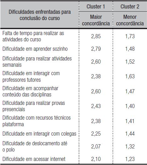Nesse tema/categoria, o cluster 2, com 59% dos pesquisados, mostra um lado positivo do curso, visto que as variáveis pesquisadas não foram expressivas na percepção dos egressos. Tem-se, na Tabela 7, a média dos escores de concordância para cada variável.