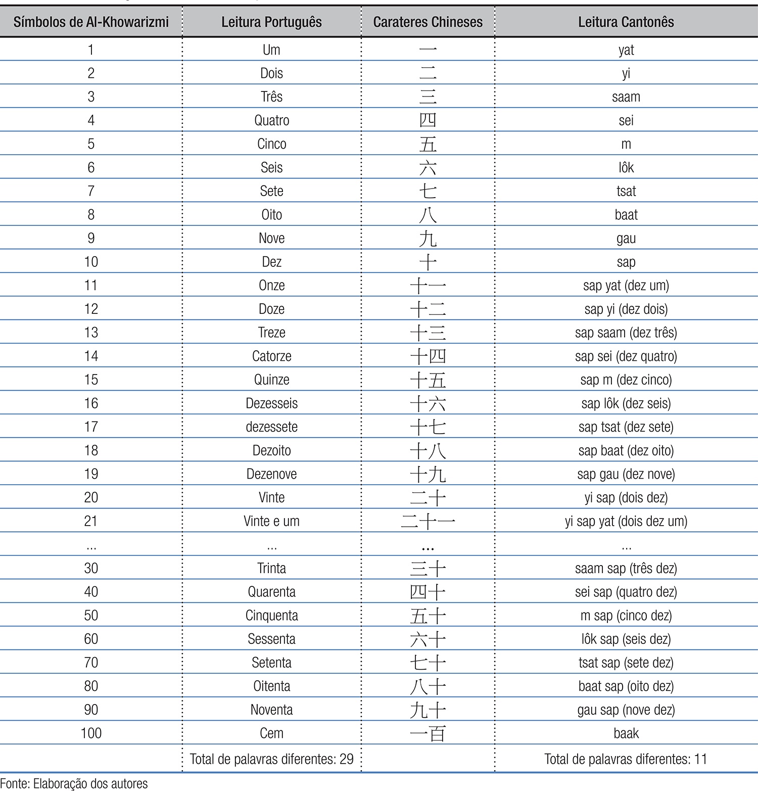 No sistema chinês, o nome dos dez primeiros números é completamente arbitrário, tal como noutras línguas, mas, a partir do dez, diz-se dez um, dez dois [...]; a partir do vinte diz-se dois dez, dois dez um, dois dez dois [...], a partir do trinta diz-se três dez, três dez um, três dez dois e assim sucessivamente até chegar ao cem, a partir do qual se retoma a lógica de decomposição do número (ver Tabela 1).