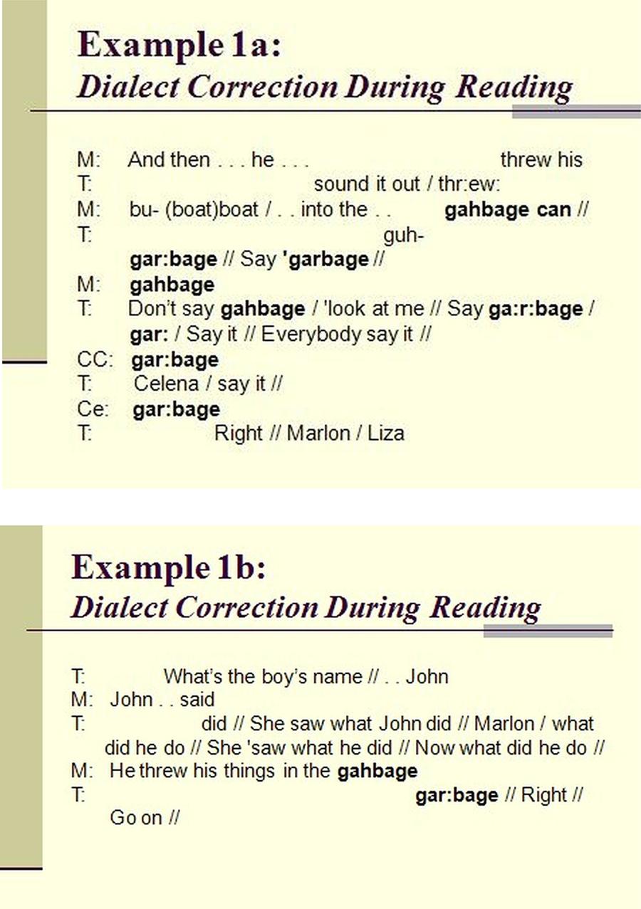 In 1a and 1b, we see examples of reading group interaction in which response to dialect is prominent. Here the effort is to correct “gahbage can” to “garbage can”, focusing on the presence or absence of post-vocalic R. In the fuller publication, I analyze in detail what we can see from inspection below: Concern with regulating pronunciation can distract from the activity of reading (COLLINS 2006[1986], p. 158).