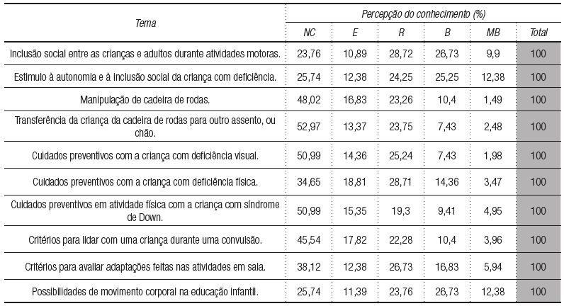 Em relação a estímulos à autonomia e à inclusão social de crianças com deficiência, o índice declarado de conhecimento foi de 37,63%; sobre inclusão social entre adultos e crianças em atividades motoras, foi 34,65%. Índices semelhantes foram observados para o desconhecimento do assunto, respectivamente 38,12% e 34,65%.