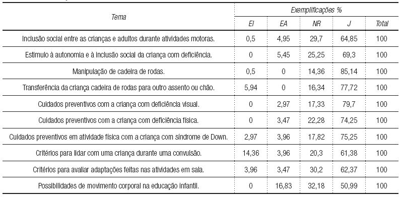 Ao se verificarem exemplos de ações a situação fica ainda mais grave, pois não chega a 4% o índice de professores que forneceram exemplos de ações adequadas sobre como trabalhar com necessidades especiais gerais. No caso de criança usuária de cadeira de rodas, não foi encontrado nenhum exemplo sobre como transferi-la para outro assento; apenas 0,5% dos professores fizeram referência à realização da manipulação da cadeira de rodas e, mesmo assim, limitando-se à ação de empurrá-la; somente 3,47% se referiam a cuidados com obstáculos, acessibilidade e adaptações em pisos, banheiros, necessários quando se tem crianças com deficiência física.