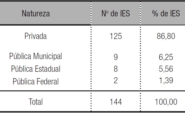 Em relação à natureza administrativa, particular ou pública (federal, estadual ou municipal), constatou-se que, do total de 144 cursos pesquisados, 125 (86,8%) são oferecidos por instituições privadas e apenas dezenove (13,2%) por públicas. Desses, oito são ofertados por instituições estaduais, dois por federais e nove por municipais, conforme a tabela abaixo: