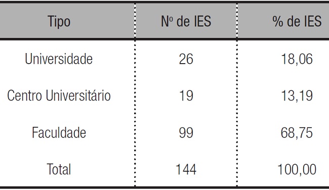 Quanto ao tipo de instituição, identificou-se que 99 cursos (69%) são oferecidos por faculdades, dezenove (13%) por centros universitários e 26 (18%) por universidades.