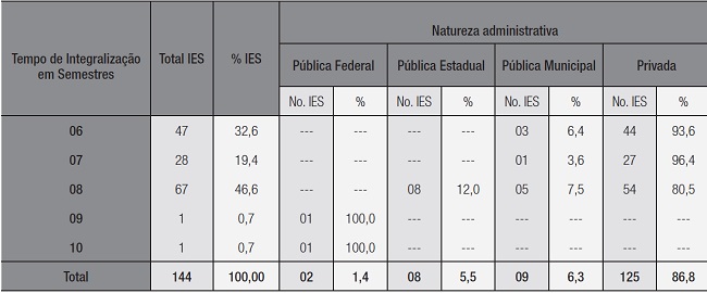 A Tabela 3, a seguir, apresenta a relação das instituições conforme a natureza administrativa e o tempo de integralização dos cursos em semestres.