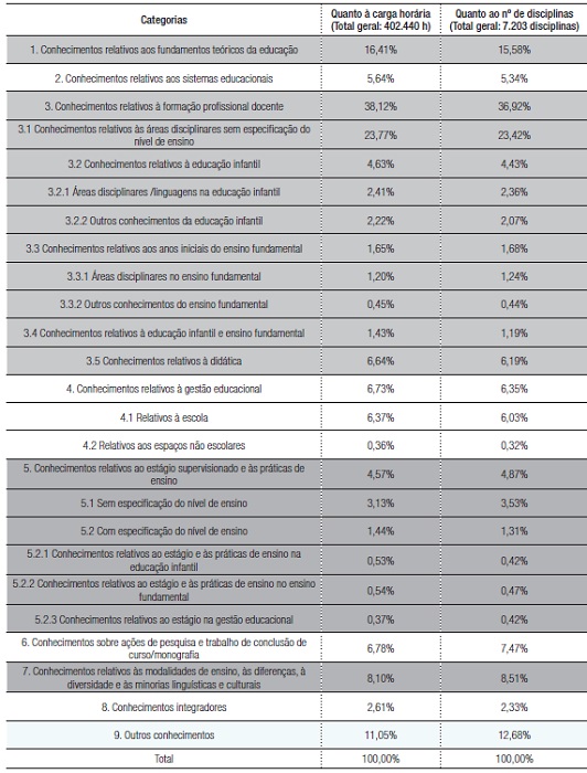 A análise detalhada das categorias expostas nesse quadro, mostra que a categoria Conhecimentos relativos à formação profissional docente representa o maior percentual – em torno de 38% da carga horária dos cursos – entre as categorias descritas. Ela contempla disciplinas relacionadas aos conteúdos curriculares (língua portuguesa, matemática, história, geografia, ciências, artes, educação física, alfabetização, movimento, linguagem oral e escrita, natureza e sociedade, por exemplo), normalmente vinculados às suas respectivas metodologias de ensino, assim como outros conteúdos relacionados com a prática docente na educação infantil e nos anos iniciais da escolarização. No entanto, percebe-se que desse percentual de conhecimentos profissionais, a maioria, 23,77% (referente à carga horária), e 23,42 % (referente ao número de disciplinas), não especifica se se referem à formação para os anos iniciais do ensino fundamental ou para a educação infantil.