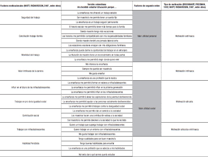 Pese a la diversidad metodológica y conceptual tenida en cuenta hasta la fecha, estudios como los de Klassen y otros autores (2011) y Watt y otros autores (2012) han propuesto métodos consensuados que permiten hacer comparaciones entre los distintos países y así poder aprender de los efectos de las medidas tomadas. Tal es el caso del modelo de medición de la motivación, aplicado a la elección de la carrera docente, desarrollado por Watt y Richardson (2007), conocido como FIT-choice scale (escala de los factores que influyen en la elección de la carrera docente). Modelo que estimamos de utilidad para el abordaje del tema propuesto, al ofrecer una visión más completa del porqué las personas escogen la docencia como profesión (DESHANO, 2012) y de los factores presentes en estudios de motivación para ser profesor (BERGER; D’ASCOLI, 2012).
