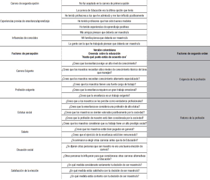 La encuesta recoge una primera parte de datos sociodemográficos y los factores motivacionales y de percepción (propiamente los del FIT choice) que son una escala Likert de 1 al 7, siendo 1 Nada de acuerdo y 7 Muy de acuerdo. Para su aplicación en Colombia se ha usado la adaptación del instrumento al español (GRATACÓS; LÓPEZ-JURADO, 2016).