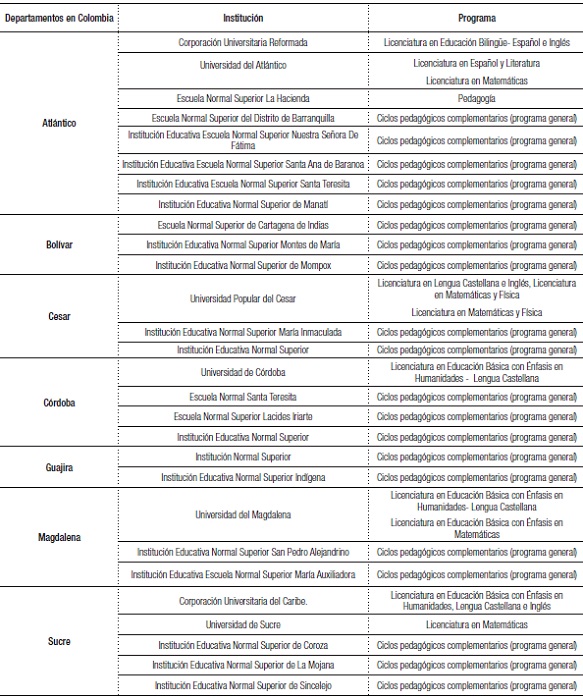 El presente trabajo parte de un estudio de tipo cuantitativo, cuya población de estudio (estudiantes vinculados a programas de pedagogía) se encontraban localizadas en siete instituciones de educación superior (oficiales y privada), los cuales ofertan diez programas relacionados con el área de pedagogía y en 21 ENS (oficiales y privadas) reflejado en la tabla 2.