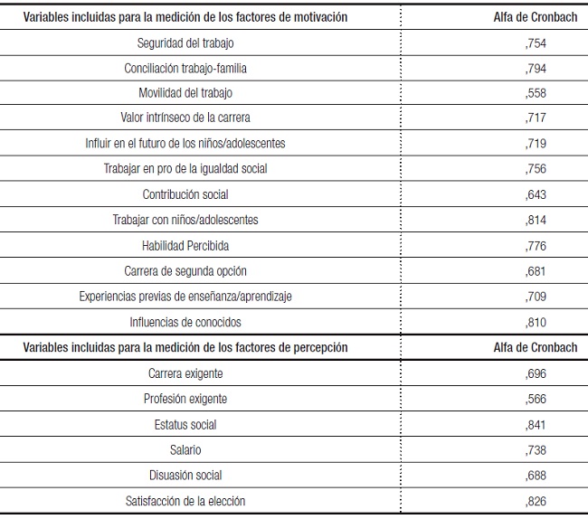 La tabla 3, nos muestra los resultados obtenidos, a partir de los estadísticos de fiabilidad (alfa de Cronbach) relacionados con las variables generales tenidas en consideración para la medición de los diferentes factores tenidos en cuenta en este trabajo (motivacionales y percepciones), los cuales ponen de manifiesto la solidez del constructo, tenido en cuenta al momento del diseño y ajuste final del instrumento puesto en práctica para la recolección de los datos mostrados en este artículo, al obtener valores superiores a 0,600, salvo en el caso de la variable exigencia de la profesión, la cual fue mantenida, en vista de nuestro interés de establecer comparaciones con resultados obtenidos en otros contextos internacionales, con base a los autores mencionados al comienzo de este apartado.