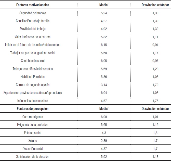 Al revisar los factores motivacionales que presentaron mayor valoración entre los estudiantes encuestados, destacan en primer lugar el influir en el futuro de los niños/adolescentes, contribución social en segundo lugar y experiencias previas de enseñanza/aprendizaje en tercer lugar. Los factores relacionados con la motivación extrínseca quedan entre los cinco últimos factores junto con los de influencias conocidos y carrera de segunda opción. Cabe destacar que el factor menos valorado ha sido este último.