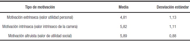 Con respecto a los resultados obtenidos para los tres tipos de motivaciones, el valor que obtiene mayor puntuación es la motivación altruista (5,89), seguida de un valor muy similar por la motivación intrínseca (5,82) y algo por detrás queda la motivación extrínseca (4,81) (tabla 5).