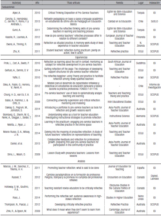 La revisión de literatura se ha organizado en base a la sistematización de artículos pesquisados en las bases de datos de la World of Science (ISI y ScIELO) y SCOPUS, usando combinaciones de las siguientes palabras clave: reflect teacher education y pre-service teachers; reflexión docente, reflexividad docente, formación inicial docente. La búsqueda se ha acotado a los últimos cinco años -2009-2014-, considerando que este rango de años cubre el periodo inmediatamente posterior al de la última revisión realizada en Chile acerca del tema (GUERRA, 2009).