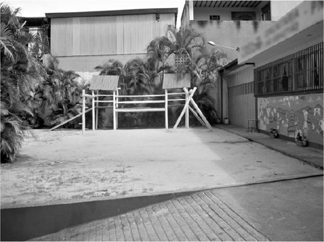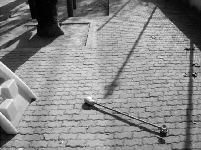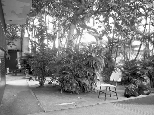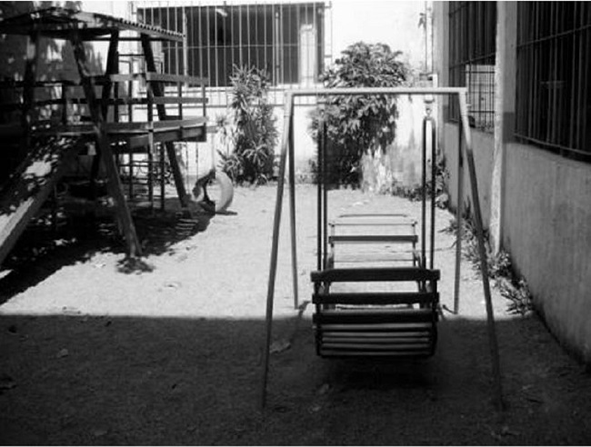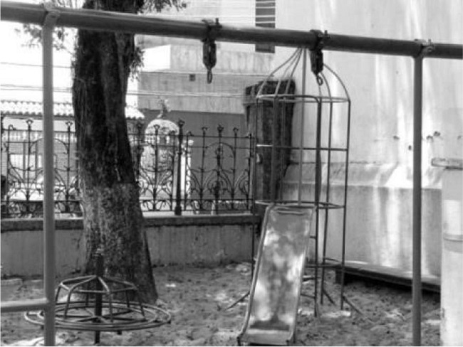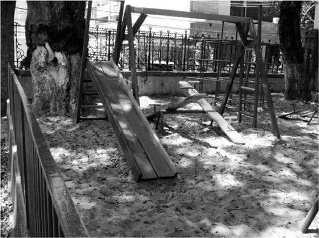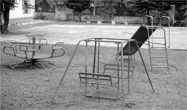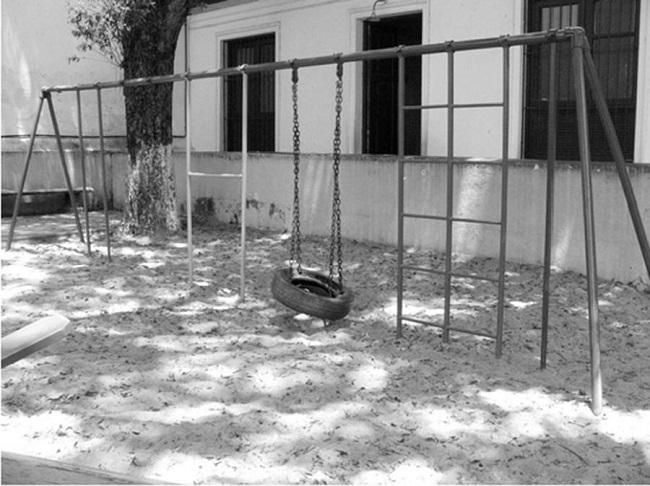 Em quatro escolas, encontram-se vestígios deixados pelas crianças, indícios de suas atividades e brincadeiras. No pátio da escola 2, vê-se uma pequena cadeira de balanço virada, duas cadeirinhas tombadas e um cavalinho de pau no chão. Tanto a cadeira de balanço, em madeira, como o cavalinho de pau são brinquedos que não são próprios da área externa, e o fato de estarem no pátio indica que foram esquecidos lá. A cadeira de balanço virada e as cadeiras tombadas remetem às brincadeiras das crianças, que subvertem o uso dos objetos ao experimentar novas perspectivas, como bem observou Benjamin (1995).