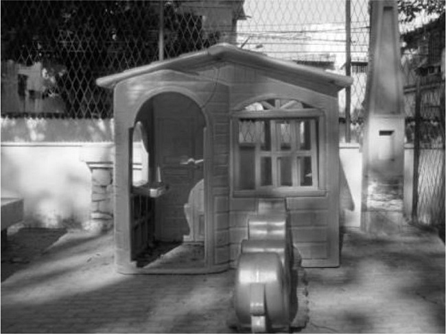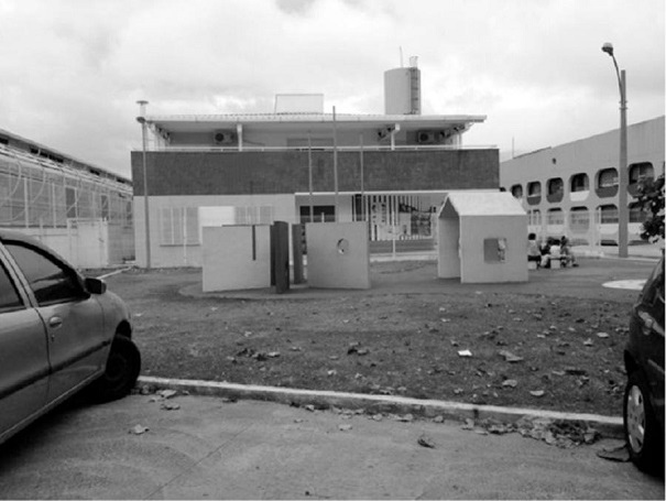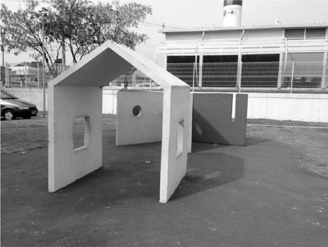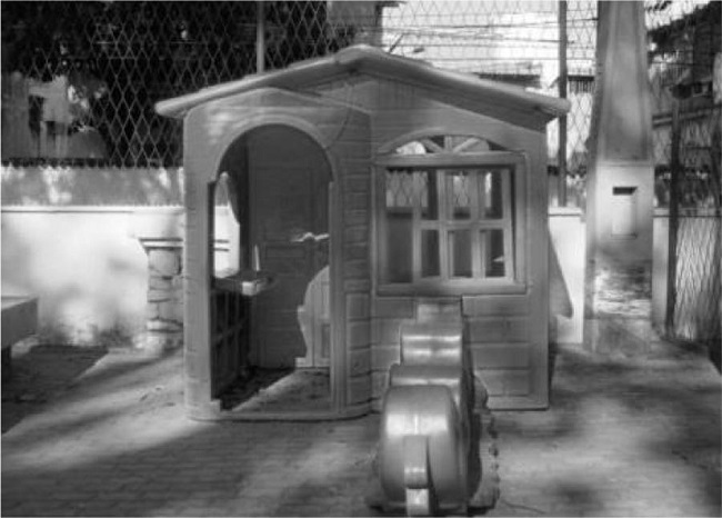 Chama atenção a ausência de casinhas de boneca: das nove escolas, apenas quatro têm casinhas, sendo que uma delas não é exatamente uma casinha, embora remeta a uma casinha pelo formato do telhado. Uma das escolas tem três casinhas de boneca, sendo duas em plástico e uma em alvenaria. Esta última, porém, servia como depósito quando as fotografias foram tiradas, o que impossibilitava o uso pelas crianças.