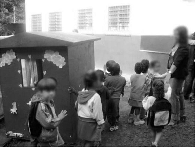 Embora a presença da casinha não seja condição para que as crianças brinquem de faz de conta, sua materialidade as convida à brincadeira. Diante da dificuldade de ter uma casinha nas salas, o pátio é o espaço privilegiado. O fato de somente quatro escolas terem casinhas de boneca sinaliza que, apesar de muito se falar na importância da brincadeira para as crianças, ela não é valorizada nem nos espaços destinados à brincadeira, os pátios. Parece continuar existindo um abismo entre a teoria e a prática, entre o discurso e o cotidiano da educação infantil. Nenhuma das escolas tem anfiteatro, ou espaço semelhante, dedicado às dramatizações. Isso evidencia que a brincadeira, especialmente o faz de conta, não é prioridade da educação infantil.