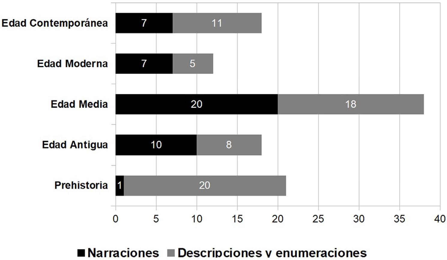 Teniendo en cuenta el conjunto de composiciones analizadas (n=107), es interesante observar cómo el 43% de las mismos (n=46) se limitan a realizar una mera enumeración de datos históricos inconexos en los que, mediante nombre propios y hechos aislados, intentan realizar una descripción del periodo trabajado. Dicho tipo de narraciones, per se, carecen de cualquier categoría asociada a la relevancia histórica, asumiendo la historia como sucesión de hechos pero sin atribuir ningún tipo de relación causal a los mismos. Es decir, que para ellos parecen ser importantes pero no siempre pueden aportar las razones, por eso se diferencia entre las composiciones que son meramente enumeraciones de hechos o aquellas que intentan describir algún elemento añadido. La libre elección de unos hechos sobre otros, indica que están más presentes en su memoria. Como se puede imaginar, el alumnado no concibe todos los periodos por igual ( Gráfico 1 ).