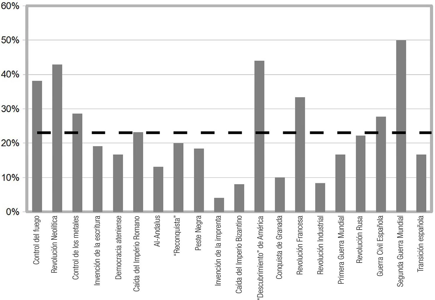 Para la Prehistoria, uno de los hechos más determinantes es el desarrollo de la industria lítica y la invención de la agricultura que son presentados como elementos de cambio que culminan con la sedentarización ([T014, T073]). La Edad de los Metales, por ejemplo, posee unas consecuencias claras, la invención de las armas y, por consiguiente, el desarrollo de las guerras ([T042, T048]). Para el mundo antiguo una de las escasas reflexiones sobre por qué un acontecimiento merece la pena ser recordado se encuentra en la aparición de la democracia en Atenas ([T045]) y su influencia actual en el mundo. La Revolución Francesa, por ejemplo, es otro de esos momentos determinantes para ellos. No solo por la cantidad de menciones sino porque en ocasiones ([T093]) se reflexiona sobre su papel en la historia como punto de inflexión a la hora de derechos sociales.