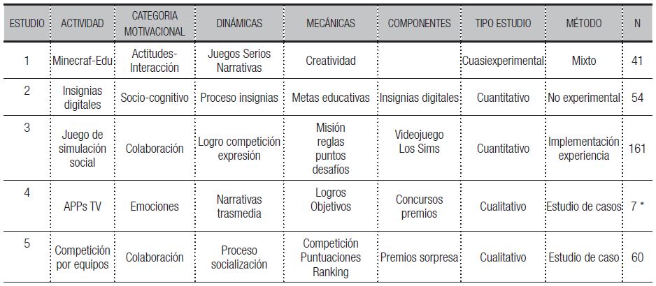 En la tabla adjunta se presentan las características generales de los estudios seleccionados, en base a los elementos implementados (Dinámicas, Mecánicas y Componentes) según Werbach y Hunter (2012) en los cinco documentos del estudio, así como la categoría motivacional, el tipo de estudio, método implementado y muestra de estudio, siguiendo a Hamari, Koivisto y Sarsa, (2014).
