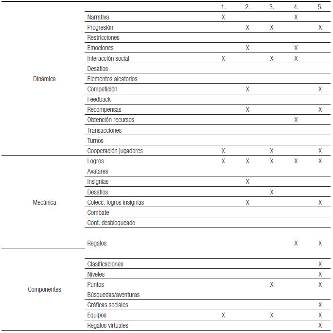 El análisis de los elementos de gamificación utilizados en las cinco experiencias estudiadas dentro de las dinámicas, mecánicas y componentes, se presenta en la tabla adjunta, señalando los elementos de las mismas (BARRIENTOS, 2016).