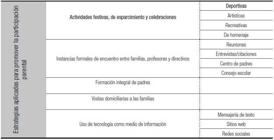 Podría decirse que las estrategias que las escuelas implementan para fomentar la relación con las familias son limitadas y coincidentemente con lo indicado por la UNESCO (2004) son tradicionales y que no están de acuerdo a los cambios que ha experimentado la sociedad chilena. No se encontraron prácticas relativas al ejercicio del voluntariado de padres y profesores en las escuelas, a estrategias de colaboración con la comunidad, ni tampoco experiencias que se orientasen explícitamente a apoyar el aprendizaje en el hogar, tal como lo sugieren Epsetin (2011) y LaRocque, Kleiman y Darling (2011).
