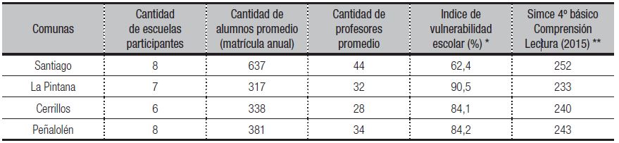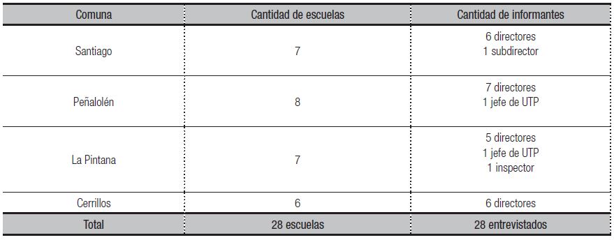 La muestra consistió en veintinueve escuelas básicas municipales o públicas de cuatro comunas de la Región Metropolitana, previendo que cada comuna representara territorialmente una zona geográfica de la Región Metropolitana. Estas fueron: Santiago de la zona centro, La Pintana de la zona sur, Cerrillos de la zona poniente y Peñalolén de la zona oriente.