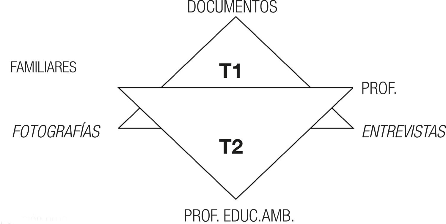 Punto de triangulación 1 (T1): Técnicas: Documentos internos (Proyecto de centro), Otros documentos, fotografías y entrevistas (٤ niveles de triangulación).