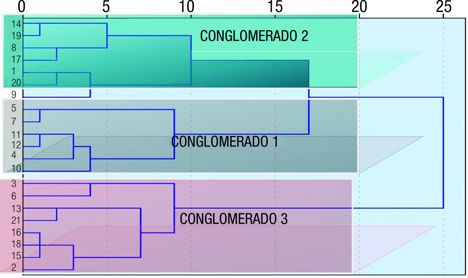 Otra alternativa para la priorización de necesidades es el análisis del mapa de la matriz de presencias versus ausencias de necesidades. Tomando su disposición binaria: 0 = ausencia; 1= presencia, una vía idónea por sus escasas restricciones de ejecución es el denominado análisis de conglomerados o cluster). En nuestro caso hemos implementado el análisis de conglomerados jerárquico mediante el método de Ward y tomando como medidas de disimilaridad las distancias euclideas cuadráticas. Los principales resultados tras su implementación, el tree diagram (dendograma) y la tabla de pertenencia, los exponemos a continuación. No obstante, antes de etiquetar a cada necesidad con un tipo de conglomerado prioritario tenemos que calcular sus promedios de índice de densidad a nivel de razón y porcentaje a partir de la tabla de conglomerados inicialmente dada por el modelo inferido. Una vez conocida la estructura inicial de pertenencia de cada necesidad a su conglomerado correspondiente se calculan los promedios a nivel de razón y porcentaje con el objetivo de etiquetar a cada necesidad con la misma clasificación utilizada en los percentiles, o sea, que identificamos los menores promedios con baja prioridad y viceversa.