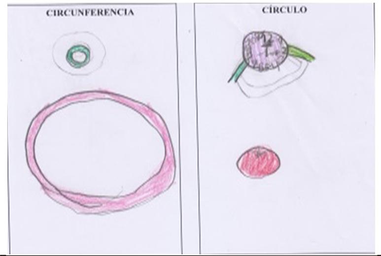 Se hace relevante comentar algunos de los dibujos realizados por los estudiantes en la tarea T3. Por ejemplo, se debe tener en cuenta que el alumno reconoce la circunferencia o el círculo desde el plano, es decir, en la superficie del objeto. Así, el alumno clasificado en la categoría A (Figura 5) distingue perfectamente las circunferencias en un donut y un anillo, y el círculo en una rueda o una raqueta de tenis. Sin embargo, el ejemplo de la categoría B ilustra cómo dicho estudiante confunde ambos conceptos al dibujar en la ficha de la circunferencia un flotador y varias pelotas verdes. En el caso de la categoría C se representan como círculos una moneda y el planeta Tierra, pero con una forma ovalada.