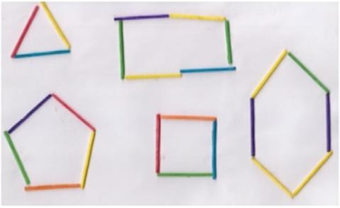 | Identificación de polígonos. | Construir polígonos con palillos. Construir un polígono con el cuerpo de varios alumnos. Manipular las piezas del tangram para construir una figura dada, y reconocer los polígonos utilizados. | Sensibilidad y gusto por la representación de construcciones geométricas sencillas. |