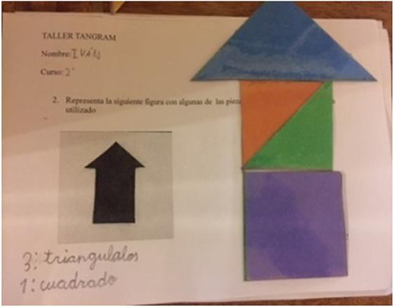 Para estas tareas, un gran porcentaje de las respuestas se concentró en las categorías A y B, siendo mayoritarios los porcentajes obtenidos en la tarea G5 del tangram (92,3% de los estudiantes) (Tabla 4). En la tarea tradicional se puede observar cómo el alumno divide adecuadamente en las partes que se piden los polígonos más sencillos (Figura 9) y es capaz de ofrecer diferentes posibilidades. Así, en la categoría A se observa cómo un alumno ha dividido el cuadrado en cuatro triángulos y en la categoría B, otro estudiante divide la misma figura en dos rectángulos. Sin embargo, la mayoría del alumnado no es capaz de dividir con éxito polígonos con más de cinco lados. Por el contrario, parece resultar más sencilla la combinación de algunos polígonos para formar la figura con las piezas del tangram. Así, 8 alumnos son capaces de combinar cuatro polígonos (triángulo grande, dos triángulos pequeños y un cuadrado) para formar la figura propuesta. Como se observa, en el ejemplo de la categoría B (Figura 10), otros estudiantes intentan construir una forma parecida con un triángulo y un cuadrado.