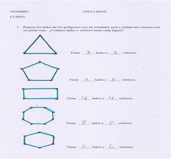 T4. Los polígonos Realización de una ficha, en la que se debe indicar el nombre de distintos polígonos dada la figura geométrica. ![]() | TIP4-1. Jugamos con palillos Se reparte a cada estudiante un folio y un sobre que contiene 24 palillos de colores. El estudiante debe formar los siguientes polígonos: triángulo, cuadrado, rectángulo, pentágono y hexágono utilizando todos los palillos dados y pegarlos el folio. TIP4-2. ¡Nos vamos al patio! Esta actividad se realiza en el patio y se divide la clase en dos grandes grupos. La profesora nombra una figura geométrica y pide a los estudiantes de cada grupo que la represente. Gana el grupo que consiga formarla en menos tiempo. ![]() |