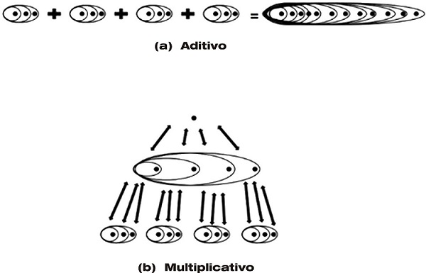 Si bien muchos consideran que la multiplicación es simplemente una forma abreviada de adición, la primera es una operación mucho más compleja que la segunda, pues requiere mayores niveles de abstracción y relaciones de inclusión, las que muchas veces deben darse en simultáneo ( PIAGET; INHELDER, 2007 ). Por ejemplo, tal como plantean Clark y Kamii (1996) desde el enfoque constructivista piagetiano, al sumar 3+3+3+3 es necesario un solo nivel de abstracción, pues cada uno de los grupos de unidades de tres se encuentra en el mismo nivel: son unidades que se incluyen sucesivamente entre sí, a través de la siguiente operación: 3 unidades más otras 3 unidades = 6 unidades; 6 unidades más 3 unidades = 9 unidades; y 9 unidades más 3 unidades = 12 unidades. Por el contrario, multiplicar 3x4 implica, primero, elaborar paquetes de 3 y establecer cada uno como una unidad independiente de las otras; segundo, en un siguiente nivel de abstracción, incluir una unidad de 3 en dos unidades de 3, dos unidades de 3 en tres unidades de 3 y tres unidades de 3 en cuatro unidades de 3, dando como resultado 12. Esta diferencia entre el pensamiento aditivo, que requiere un solo nivel de abstracción, y el pensamiento multiplicativo, que requiere dos niveles de abstracción, se grafica en la siguiente figura, tomada de Clark y Kamii (1996 , p. 42):