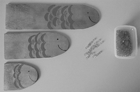 Se hizo uso de una tarea elaborada por Clark y Kamii (1996) , basada en el método clínico crítico de Piaget. Se utilizaron tres peces de madera de 5 (pez A), 10 (pez B) y 15 (pez C) centímetros y cuentas de color azul que simulaban su alimento. En la siguiente figura se observan los materiales utilizados: