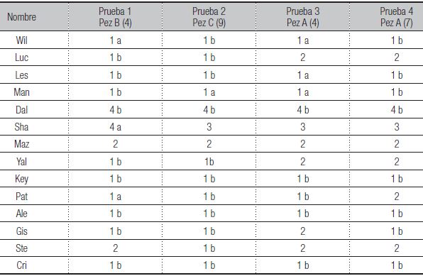 Cada pez come de acuerdo a su tamaño, en una proporción de 1 a 3 (por ejemplo, si el pez A come 3 bolitas, el pez B come 6 bolitas y el pez C 9 bolitas). En cada pregunta de la tarea, el evaluador alimentó a uno de los peces y seguidamente el estudiante debió alimentar a los otros dos. Las instrucciones que el evaluador siguió en la aplicación de este ejercicio se presentan a continuación: