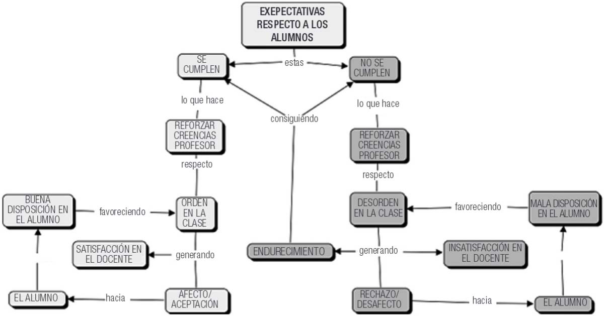 Como se ve en el esquema, hay una secuencia negativa (en gris) o positiva (en blanco) en las expectativas de los profesores con respecto a lo que consideran como un clima adecuado en el aula, donde hay disciplina, orden y donde el alumnado se comporta adecuadamente, trabaja y aprende. En función de que tenga lugar una u otra, se entra en una especie de bucle, o incluso una espiral, conduciendo una situación a la otra. La respuesta al desorden provoca entonces el endurecimiento de medidas, ya sea a través de correcciones, señalamientos, apercibimientos, amenazas, castigos y pueden aparecer en forma de llamar al orden, gritar, enfadarse, etc. Como resultado de esta dinámica, los docentes ejercerían mayor presión con aquellos alumnos que no cumplen sus expectativas, y por lo tanto parecerían más autoritarios, por la frecuencia e intensidad con la que recurren a las medidas más correctivas, resultando de este modo más duro y coactivo para lograr obediencia y, por oposición, el otro estilo aparece como más blando y permisivo. Se crearían así mecanismos perversos que harían que los que tienen más dificultades para adaptarse a la dinámica del aula recibirían más refuerzos negativos, producirían más fracaso y tendrían peor relación, o por el contrario: más reconocimiento a los que menos les cuesta.
