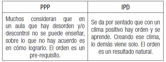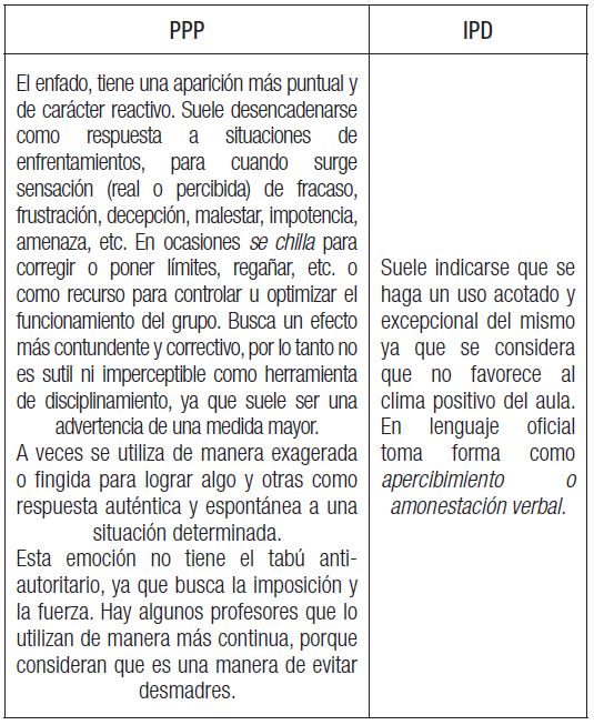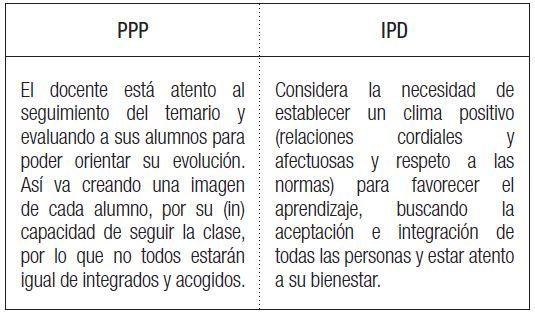 Del análisis de la información recogida sobre las creencias del profesorado en relación a las emociones que genera la gestión de la disciplina en el aula (el Pensamiento Pedagógico Práctico, en adelante PPP), se seleccionaron las más significativas y se explican contrastándolas con lo que se dice en torno a esas mismas cuestiones, desde la ideología pedagógica dominante (en adelante IPD). Las que surgieron son: