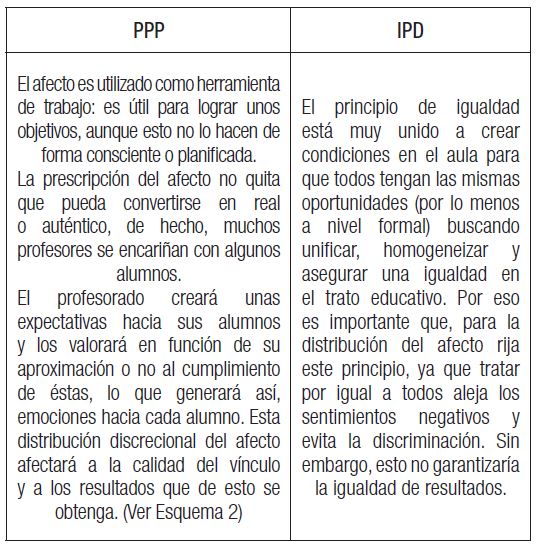 Como la información fue recogida de manera disgregada (en el sentido de que no fue información recabada ad hoc para analizar las emociones y se recogió en distintos momentos y espacios), y además fue obtenida para analizar la conflictividad, el esfuerzo se orientó a dar un hilo conductor, que sirviera para organizar los datos. Ese hilo conductor para organizar las creencias del profesorado en torno a la gestión del aula escogido son las contradicciones o diferencias que se detectaron entre el pensamiento pedagógico práctico (PPP), elaborado a partir de las fuentes primarias y la ideología pedagógica dominante (IPD), extraída de las fuentes secundarias.