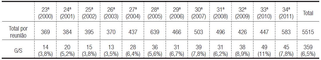 Em nosso estudo original, conseguimos quantificar de forma plena a produção sobre gênero e sexualidades na ANPEd somente a partir do ano 2000, pois apenas desde a 23ª Reunião a totalidade dos textos apresentados no evento anual ficou disponível on-line. Contudo, anteriormente a esta data buscamos verificar o maior número possível de fontes3 para, ao menos, termos uma visão preliminar relativa à presença do gênero na produção da associação.