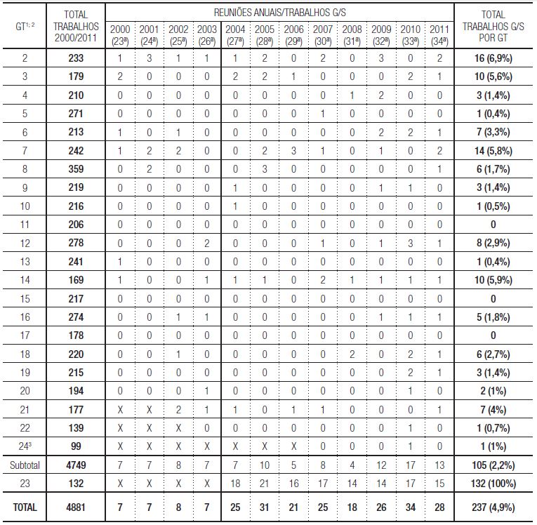 Em função dessa análise, serão levados em consideração principalmente os trabalhos e pôsteres apresentados nos Grupos de Trabalho (GTs) durante as reuniões anuais examinadas.