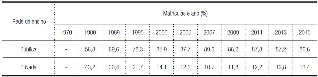 No Brasil, por sua vez, a segmentação mais significativa em vigor durante boa parte do século XX e ainda importante atualmente opõe as escolas privadas às públicas. Tendo antecedido o próprio movimento de construção do sistema nacional de ensino, que ganhou força nas décadas de 1930 e 1940, essa oposição acompanhou a fase que podemos considerar como de consolidação do sistema, que vai aproximadamente até à década de 1980. Ao longo desse período, a maior parte das matrículas no nível secundário encontrava-se no setor privado. Em 1956, por exemplo, quando se estimava que apenas 6% da população entre 12 e 18 anos encontrava-se matriculada no que era considerado o ensino secundário da época – os quatro anos finais do atual ensino fundamental e os três anos que hoje é o ensino médio – apenas 26,8% encontrava-se matriculada em escolas públicas (ABREU, 2005).