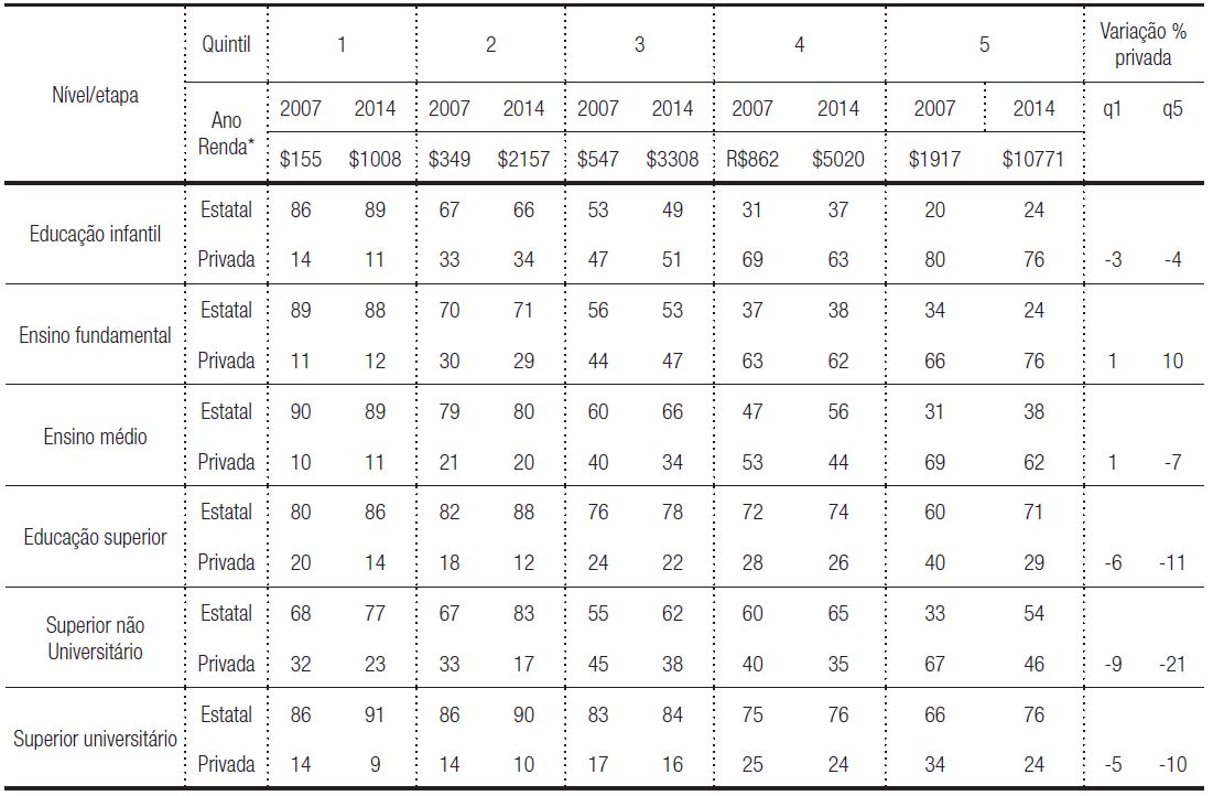 Percebe-se, que a relação é bem diferente no nível superior, pois em todas as faixas de renda os indivíduos que frequentam esse nível de ensino estão predominantemente em instituições privadas. Contudo, merece destaque que, em 2014, houve uma ligeira redução da participação da rede privada em todos os quintis de renda familiar, sem que esta rede deixasse de ser majoritária, uma mudança decorrente da expansão do ensino superior público.